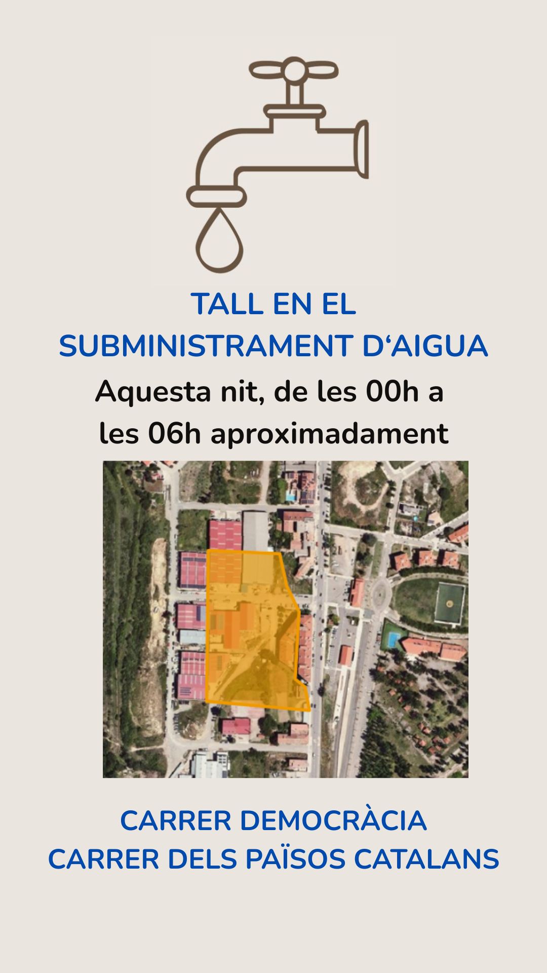 Aquesta nit, de les 00h a les 06h aproximadament, hi haurà un tall en el subministrament d'aigua que afectarà el carrer Democràcia i el carrer Països Catalans. Disculpeu les molèsties.