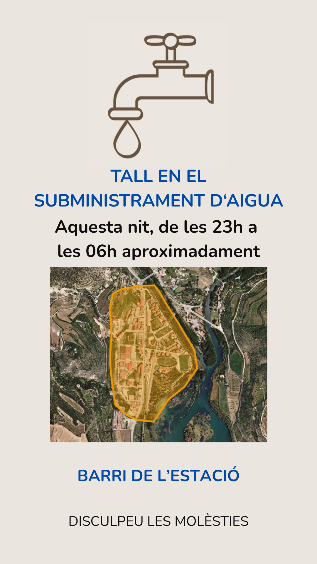 Aquesta nit hi haurà un tall en el subministrament d'aigua a tot el barri de l'Estació per detectar possibles fuites. Serà de les 23h a les 06h, aproximadament.
